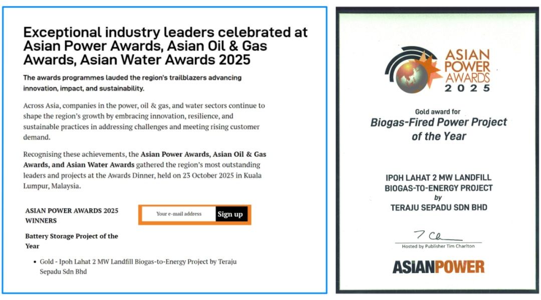 百川暢銀馬來西亞霹靂州怡保2MW沼氣發電項目(Ipoh Lahat 2 MW Landfill Biogas),于“2025年亞洲電力獎”評選中脫穎而出,榮獲“年度沼氣發電項目金獎”!